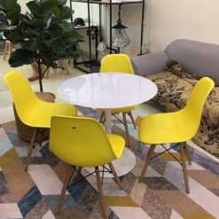Bộ Bàn Ghế Eames Nhập Khẩu đang được ưa chuộng tại các quán cà phê, trà sữa, nhà hàng, khách sạn bởi chính thiết kế của nó. Eames là sự hòa hợp giữa nhựa và gỗ, có chút pha lẫn giữa cổ điển và hiện đại. Khuôn ghế được đúc nguyên khối liền giữa lưng ghế và chỗ ngồi bằng chất liệu nhựa ABS kết hợp với sợi thủy tinh tạo độ dai và bền cho ghế. Bề mặt ghế thiết kế chống xước và tạo độ sáng bóng. Chân Ghế Eames được làm từ gỗ tự nhiên, tiện nhẵn bóng đẹp sáng bóng, kết nối các chân ghế với nhau là thanh sắt nhỏ sơn tĩnh điện cao cấp. Bàn ghế Emes cũng giúp tiết kiệm một khoảng không gian đáng kể.